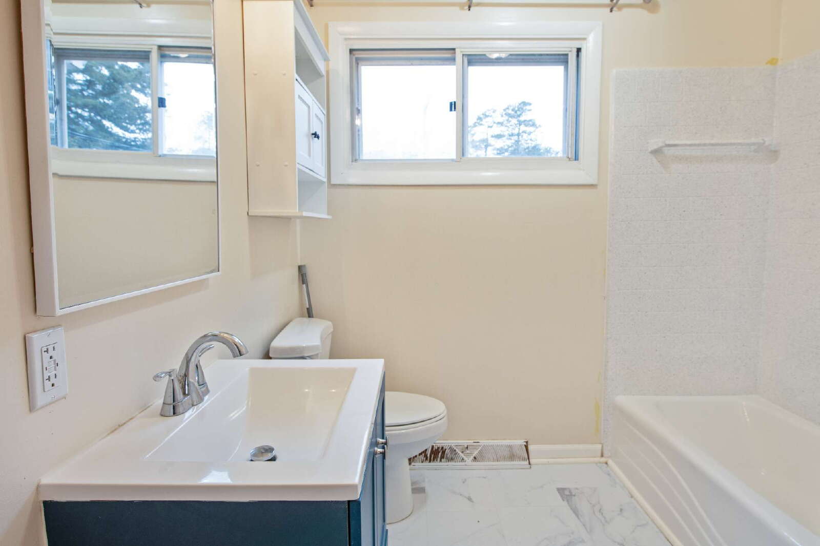 We welcome you to step through the front door into a bright living room with its oversized windows. The living room connects to the eat-in kitchen and laundry room with a full-size washer and dryer. Three bedrooms support flexible use as sleeping space, a home office, or hobby space. The bathroom has been refreshed, including a newly refinished tub and a stylish tiled accent wall. Outside features driveway parking plus a fully fenced private rear yard. A lockable storage shed adds practical storage for tools and seasonal items.